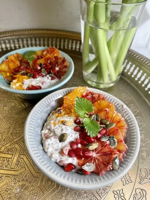 Chiapudding med blodapelsin, granatäpple och pumpakärnor.