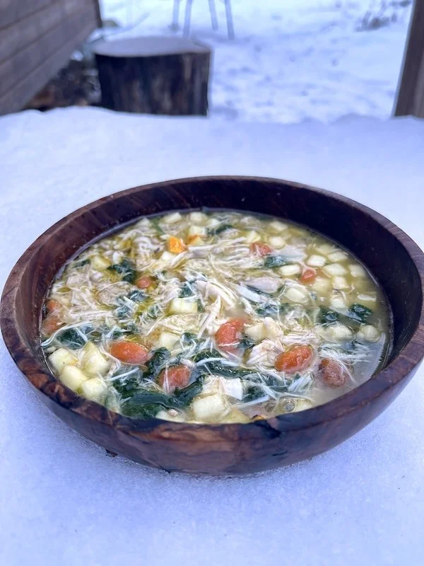 Magsnäll kycklingsoppa med grönsaker och långkokt benbuljong.*